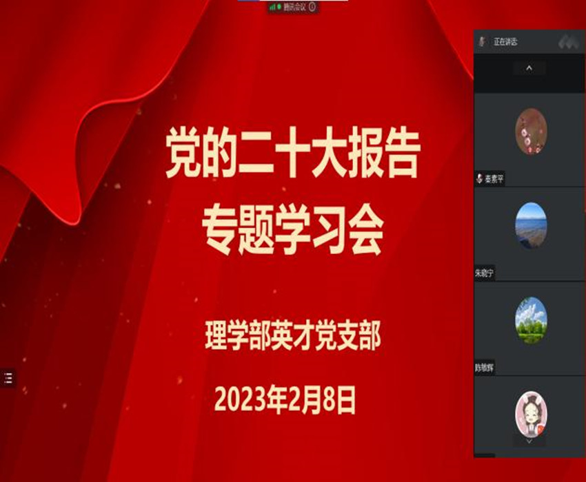 为深入学习贯彻党的二十大精神,坚持不懈用习近平新时代中国特色社会主义思想凝心铸魂,为2022年度组织生活会和民主评议党员工作做好充分的思想动员,2月8日全天,ok138cn太阳集团529英才党支部通过腾讯会议形式召开了“党的二十大报告和新党章”专题学习会。英才党支部全体党员参加学习,会议由英才党支部书记赵辉主持。