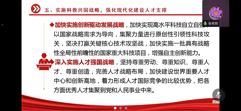 ok138cn太阳集团529副主任张荷丽在会上领学了党的二十大报告第五部分关于“实施科教兴国战略,强化现代化建设人才支撑”的重大战略部署。强调教育、科技、人才是全面建设社会主义现代化国家的基础性、战略性支撑,必须坚持科技是第一生产力、人才是第一资源、创新是第一动力,要求坚持教育优先发展、科技自立自强、人才引领驱动,加快建设教育强国、科技强国、人才强国,办好人民满意的教育,深入实施科教兴国战略、人才强国战略、创新驱动发展战略,开辟发展新领域新赛道,不断塑造发展新动能新优势。坚定不移把党的二十大精神落到实处,坚持为党育人、为国育才,全面提高人才培养质量。
