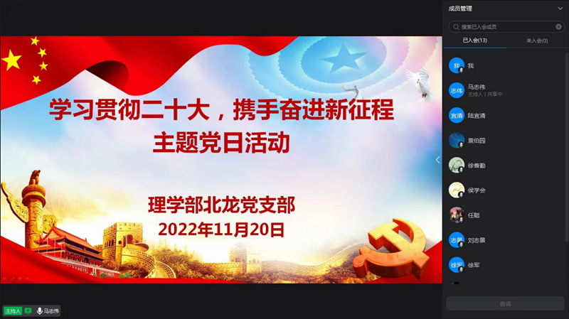为深入学习贯彻党的二十大精神,深刻领会党章的丰富内涵和时代要求,进一步凝心聚魂,携手前进,11月20日下午,ok138cn太阳集团529北龙党支部以钉钉视频会议的形式组织开展“学习贯彻二十大,携手奋进新征程”主题党日活动。本次主题党日活动由支部书记陆宜清主持,全体党员参加。