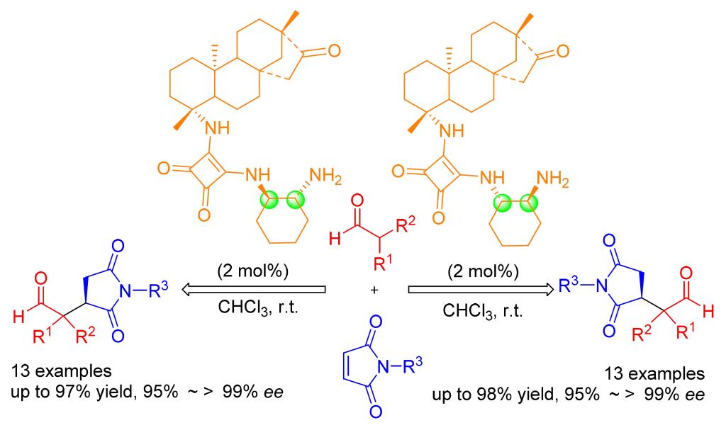 该研究设计合成了一类新型的手性双功能伯胺-方酰胺型有机催化剂,研究了其在异丁醛与取代马来酰亚胺的共轭加成反应中的不对称催化性能,首次实现了伯胺-方酰胺催化的异丁醛与马来酰亚胺的不对称加成反应。与伯胺-硫脲的催化结果相比,产物的产率和对映选择性都得到了进一步提高。该反应以两个新型方酰胺为催化剂,分别以高产率和高对映选择性得到构型相反的加成产物,为手性琥珀酰亚胺类化合物的合成提供了简便的方法。