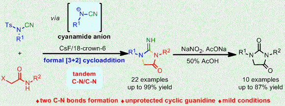 环胍化合物广泛存在于天然产物、医药和农药中,大都表现出优秀的生物活性和重要的药用价值,如杀虫、抗病毒及抗肿瘤等活性。环胍类化合物在有机合成中也应用广泛,不仅可以作为手性催化剂应用于不对称合成,还可作为金属配体应用于均相催化反应。因此,发展环胍化合物合成新方法的研究备受关注。该研究利用N-Ts氰胺在氟离子作用下脱Ts得到的氰胺负离子与α-卤代酰胺的SN2/cyclization串联环化反应,高效地构建五元环胍骨架,产率最高达99%,产物经水解可以得到相应的海因类化合物。该研究为环胍化合物的合成提供了新的合成策略,具有很好的应用前景。