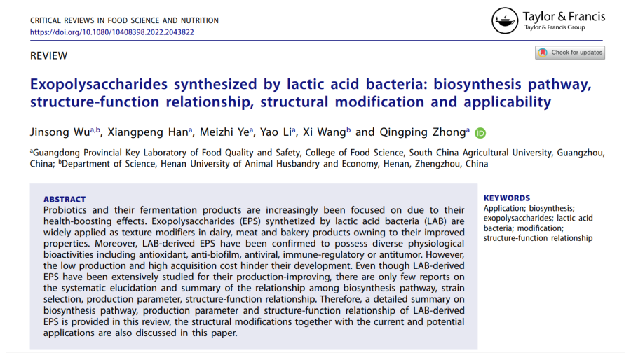近日,ok138cn太阳集团529教师、华南农业大学2021级博士生吴金松,以第一作者身份,在食品领域国际顶级期刊《Critical Reviews in Food Science and Nutrition》(最新影响因子11.176,中科院一区)发表了题为 “Exopolysaccharides synthesized by lactic acid bacteria: biosynthesis pathway, structure-function relationship, structural modification and applicability”的综述文章(https://doi.org/10.1080/10408398.2022.2043822)。该工作得到了国家自然科学基金、国家十三五重点研发专项、广东省自然科学基金等项目的资助。