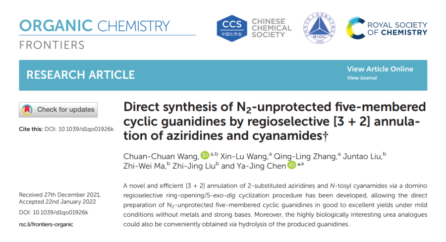 王川川博士一直致力于利用串联环化反应构建含氮杂环骨架方面的研究。在前期关于环胍化合物的合成研究基础之上(J. Org. Chem.2021,86, 3546)(中科院2区),利用N-Ts氰胺与氮杂环丙烷的[3+2]环加成反应,实现了N2位无保护的环胍骨架的快速构建。该方法反应条件温和,官能团兼容性好,以中等至优秀的收率,优异的区域选择性合成了一系列在有机化学及药物化学中具有重要价值的五元环胍化合物。