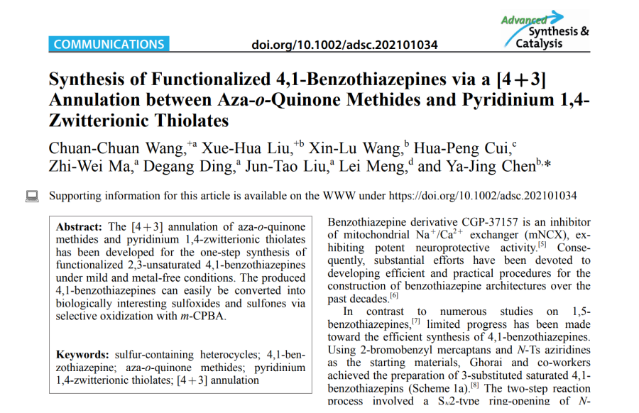 此外,王川川博士还利用1,4-吡啶硫醇两性离子与原位生成的氮杂邻亚甲基苯醌(ao-QMs)的[4+3]环化反应实现了4,1-苯并硫杂卓类化合物的高效合成。通过控制氧化剂的添加量,可以选择性的实现将产物氧化为亚砜及砜,由于不同氧化态的4,1-苯并硫杂卓往往表现出不同的生物活性,因此实现选择性氧化对生物活性筛选具有重要意义。