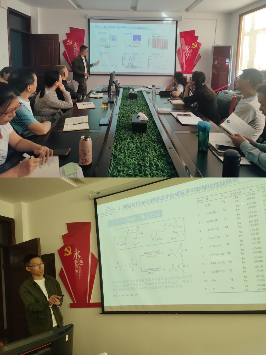 马志伟博士汇报了自己的研究方向、代表性业绩、近年来的研究进展以及遇到的困难。马博士在博士期间主要从事新型有机催化剂的设计合成及不对称催化性能研究,考虑到与学校应用型大学目标结合,逐渐将自己的研究方向转为荧光探针方面的研究,利用荧光探针对小分子物质的检测方法应用在各种检测和标记中。比如测定金属离子、农药残留、生物分子含量、示踪生物分子,标记大分子及细胞和亚细胞结构等方面。与会教师还与马博士就科研方面的问题进行了交流。