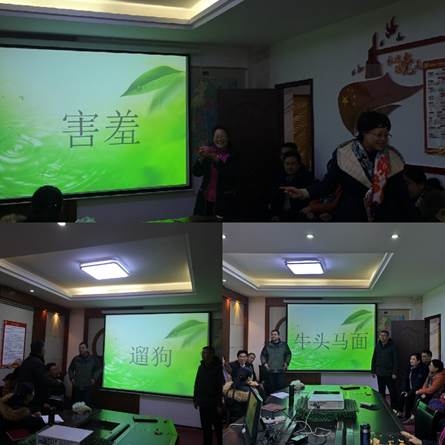 活动中,全体教工分为两个组,每组节目由3人完成,这3人分别是成语提示者(由总指挥依次在两组中选定)和两组指派的选手。在规定时间内,提示者将ppt上的成语提示或比示给选手,两位选手现场抢答。活动现场气氛异常热烈,不时引来阵阵掌声和笑声。在猜到“暴跳如雷”、“鸡飞狗跳”、“张牙舞爪”等成语时,提示者投入地近乎形象表演,抢答者则或是迷茫,或是给出千奇百怪的答案,令人多次捧腹大笑,节目不得不暂时中断。有的老师还一边加油,一边商量对策,更多的人则急得摩拳擦掌、跃跃欲试。现场笑点频出,异常欢乐。