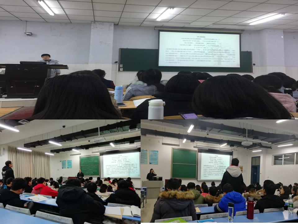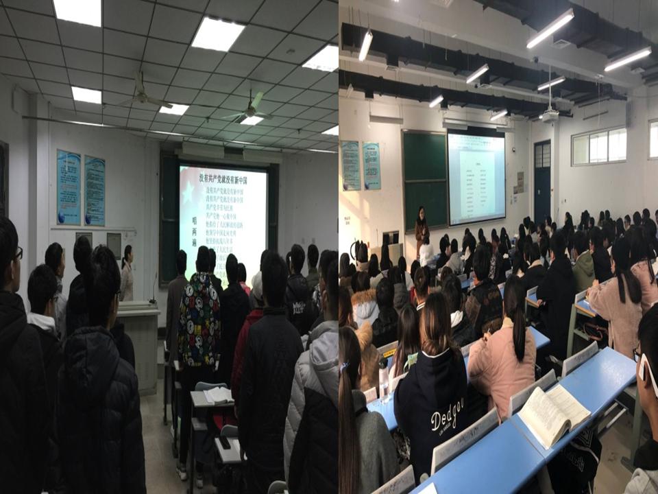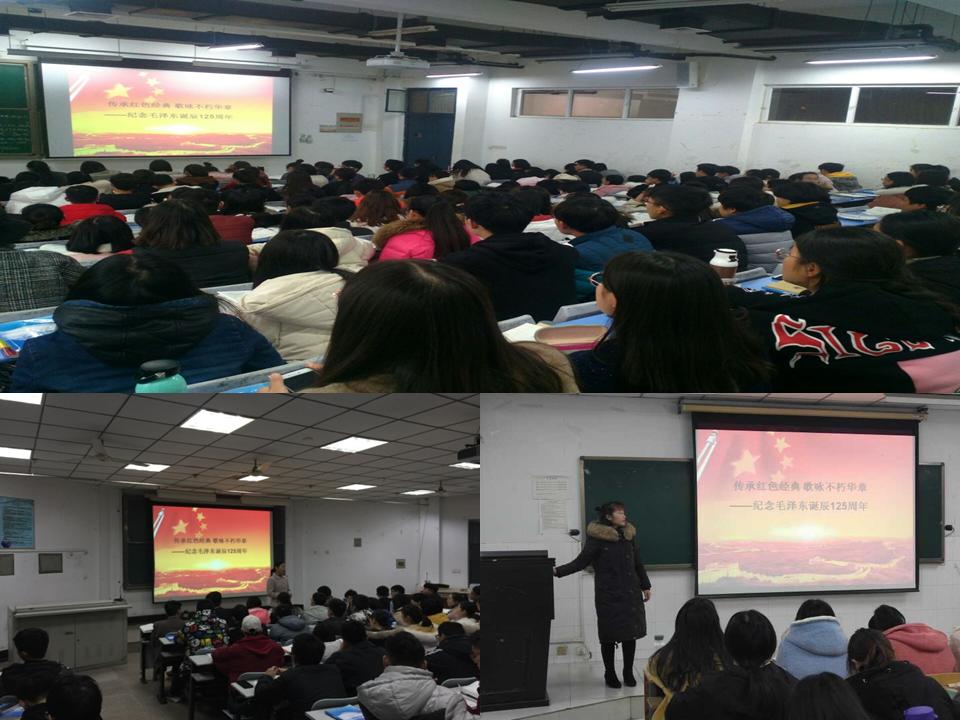 活动自本月17日以来持续进行,在25日、26日达到高潮。老师们自觉利用课前几分钟时间和第一张ppt进行宣传教育。他们在课堂用第一张ppt打出“纪念毛泽东诞辰125周年”,让同学们感觉到中华伟人的力量;他们带领学生们诵读毛泽东经典诗词,特别是《诉衷肠》:“当年忠贞为国愁,何曾怕断头?如今天下红遍,江山靠谁守……”让同学们认识到新中国的来之不易和中华儿女肩头的责任;他们带领大家唱红歌《打靶归来》、《没有共产党就没有新中国》,振奋了新一代青年的热血和力量。